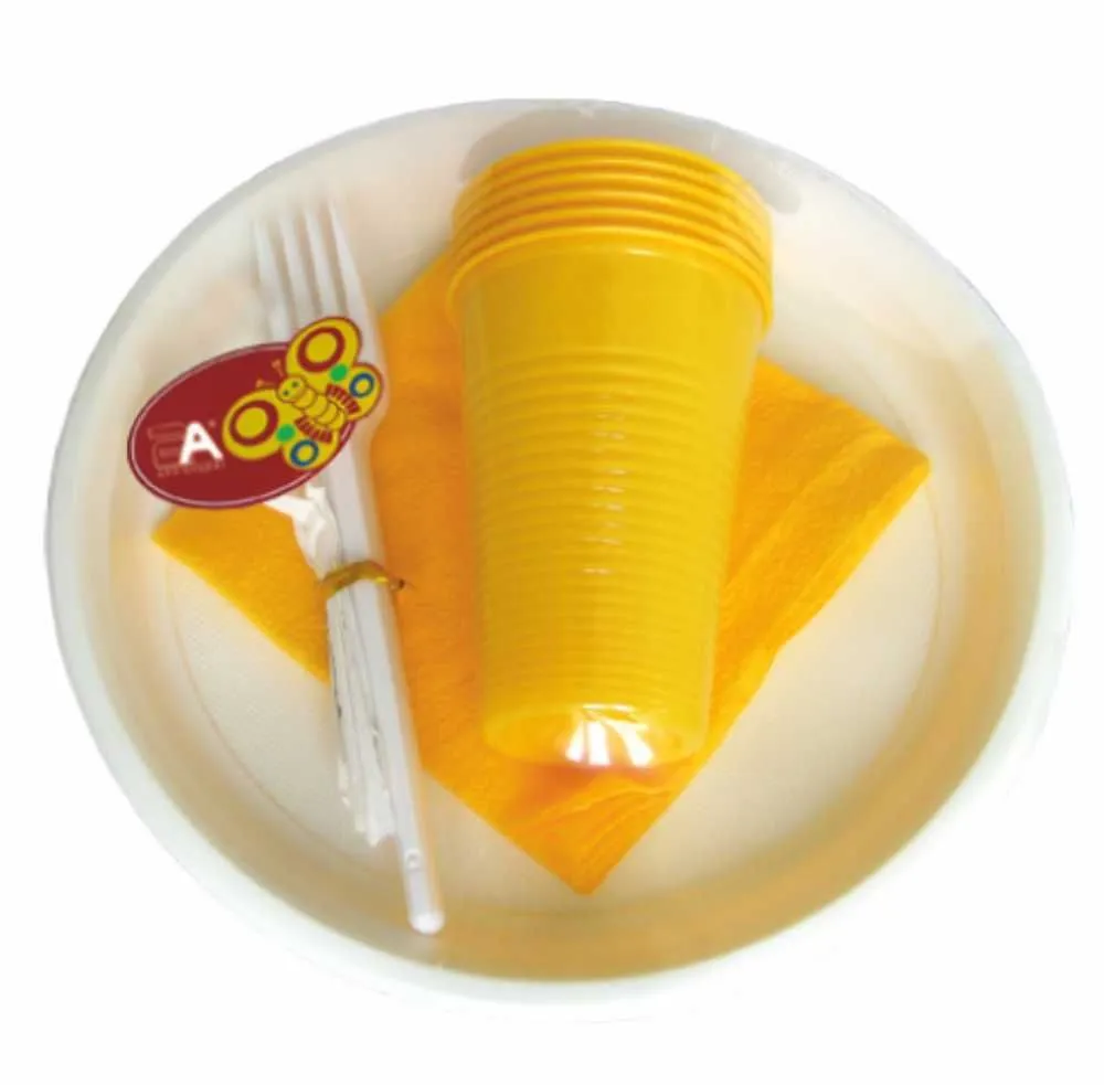 В набор пластиковой посуды входят: тарелки  6шт, одноразовые стаканы желтые 6 шт, одноразовые вилки белые 6шт,  салфетки желтые, зубочистки в индивидуальной упаковке 6 шт