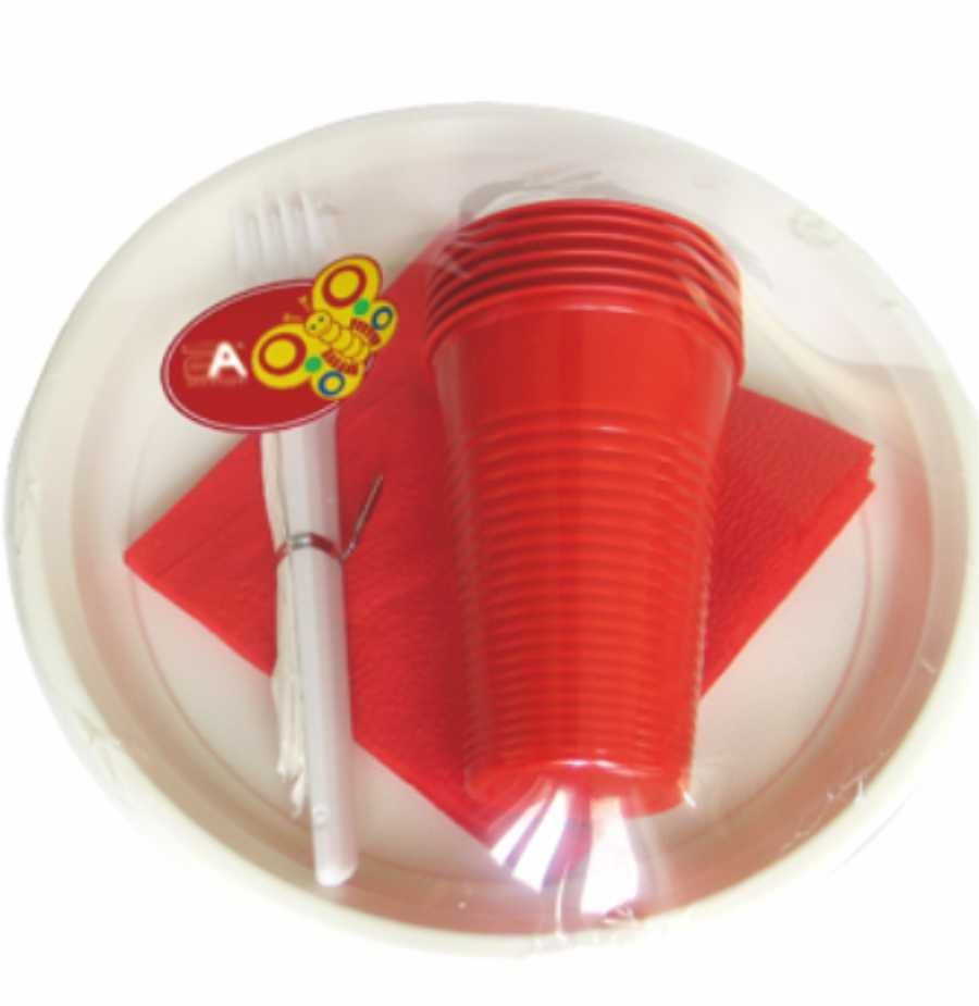В набор пластиковой посуды входят: тарелки  6шт, одноразовые стаканы красные 6 шт, одноразовые вилки белые 6шт,  салфетки красные, зубочистки в индивидуальной упаковке 6 шт