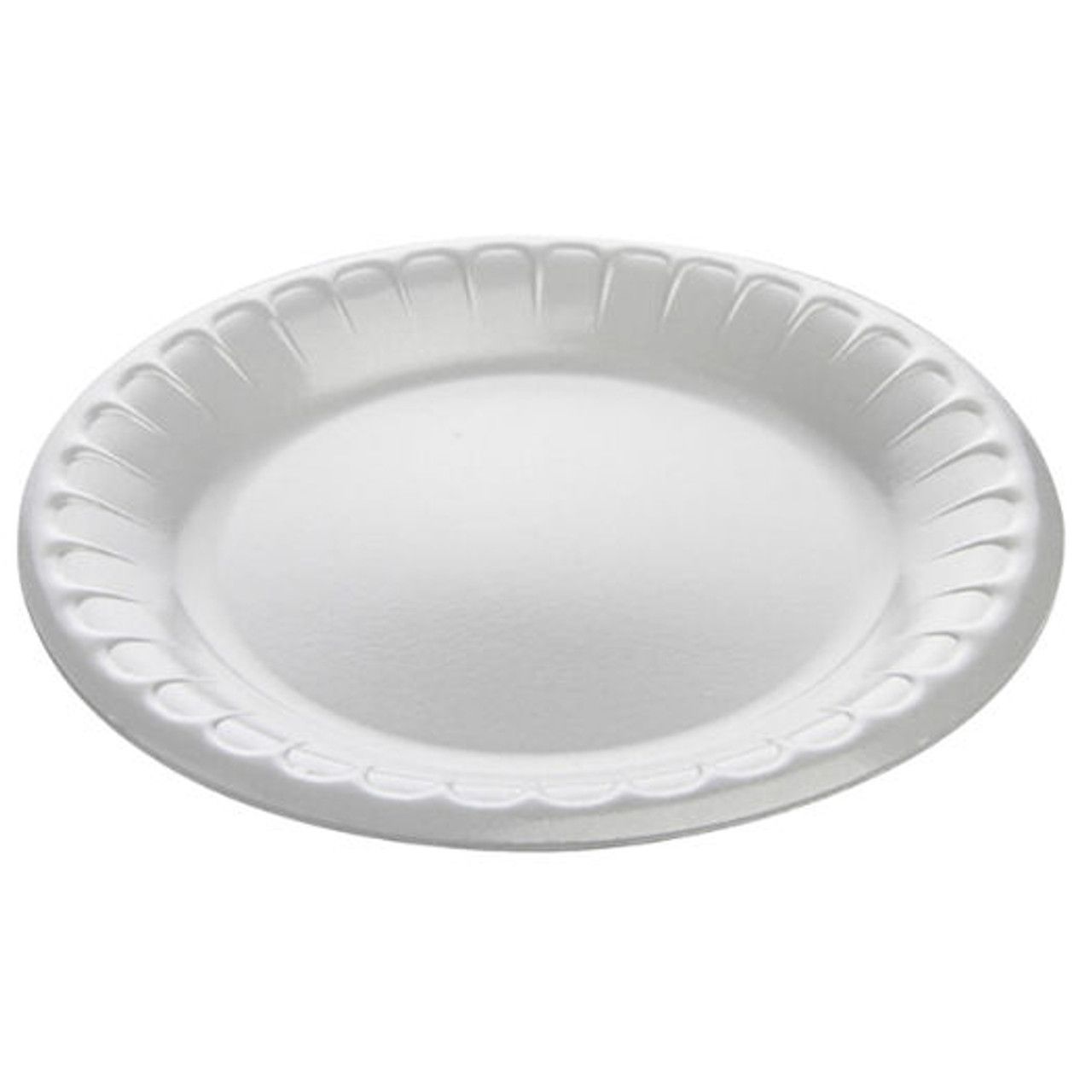 Одноразовые тарелки изготовлены из полистирола. Материал экологически безопасен, не выделяет токсических веществ при взаимодействии с горячей пищей.  Предназначены для сервировки горячих и холодных блюд. Диаметр 170 мм