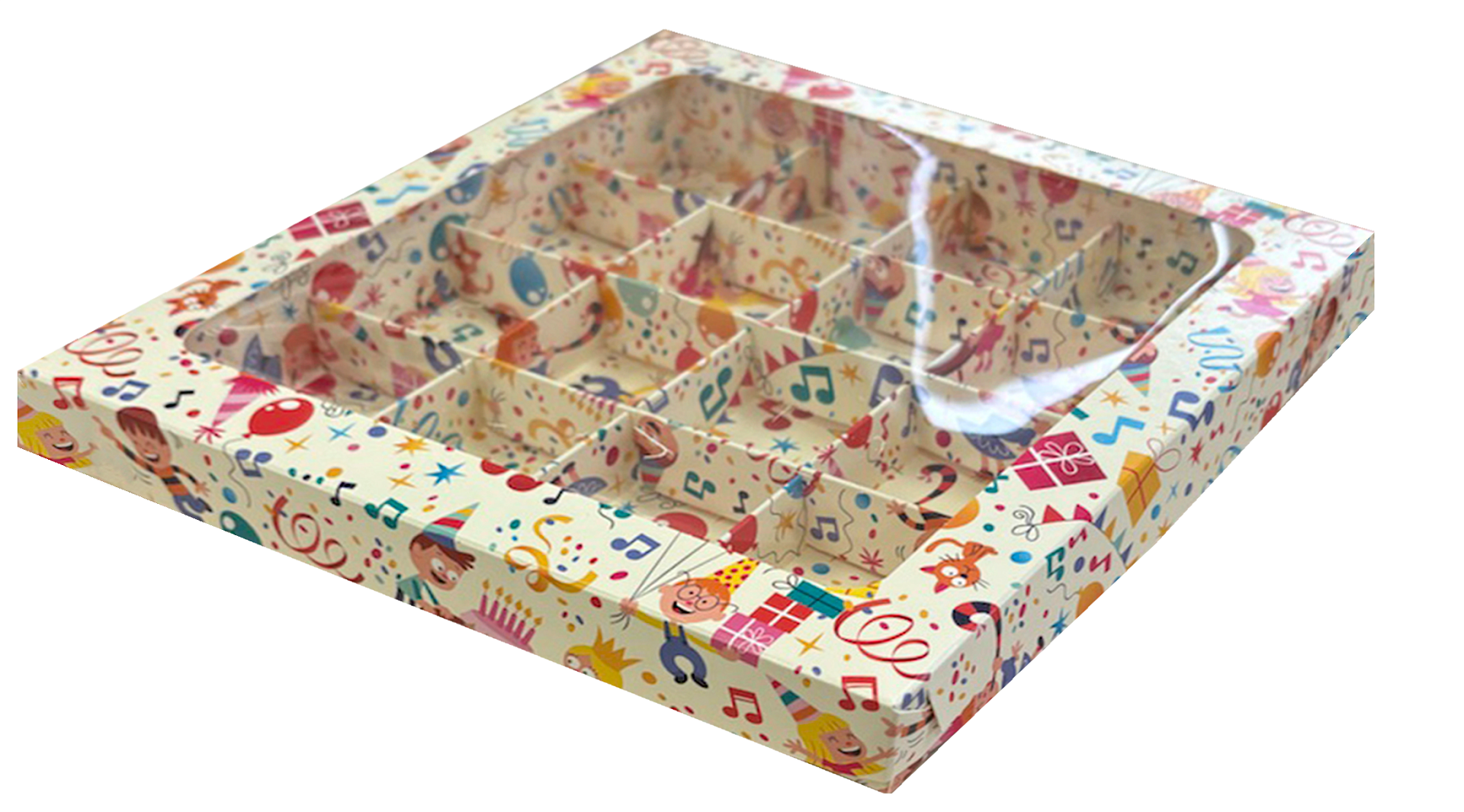 коробка бум. 200х200х30 детская с прозрачным окном