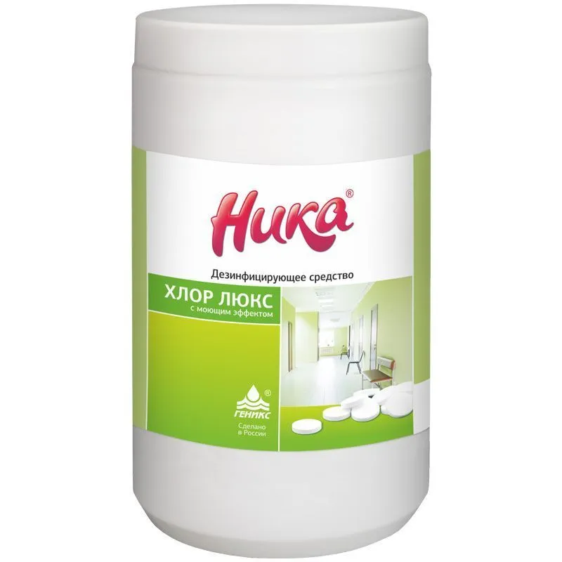 Дезинфицирующее средство «НИКА-Хлор» 1 кг в таблетках — хлорсодержащее средство на основе натриевой соли дихлоризоциануровой кислоты для приготовления дезинфицирующих растворов, предназначенных для обработки поверхностей, посуды, белья, медицинских отходов и биовыделений.