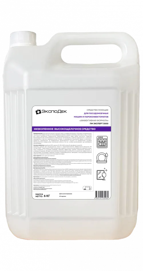 Моющее средство для ПММ и пароконвектоматов «Эффективная формула» 6 кг — щелочной концентрат для автоматической мойки посуды в профессиональных посудомоечных машинах и внутренних поверхностей пароконвектоматов. Предназначено для удаления белковых, углеводных и жировых загрязнений; низкопенное, содержит антикоррозионные добавки. Его основные преимущества: - Эффективно удаляет белковые и углеводные загрязнения, обладает высокой обезжиривающей способностью. - Низкопенное — не забивает форсунки ПММ. - Антикоррозионные добавки защищают нержавеющую сталь, пластик, стекло. - Экономичное: дозировка 0,8–1,8 мл/л воды. - Состав: щелочь 15–30%, комплексообразователи 5–15%, неионогенные ПАВ <5%, вода >30%. Рекомендуется для профессиональных посудомоечных машин всех типов, пароконвектоматов на кухнях ресторанов, кафе, столовых, пищевых производств. Разрешено к использованию в школьных и дошкольных учреждениях, в детских оздоровительных лагерях.