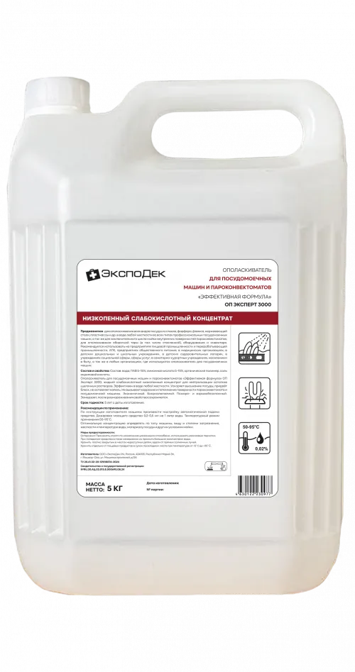 Ополаскиватель для ПММ «Эффективная формула» 5 кг — кислотный концентрат для финального ополаскивания посуды в профессиональных посудомоечных машинах и пароконвектоматах. Удаляет остатки моющего средства и накипь, обеспечивает блеск, ускоряет высыхание без пятен.