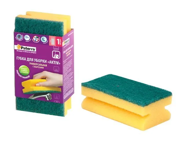 Идеальна для уборки помещений. Благодаря вырезам губку PATERRA удобно держать. Качественные материалы гарантируют долговечность.