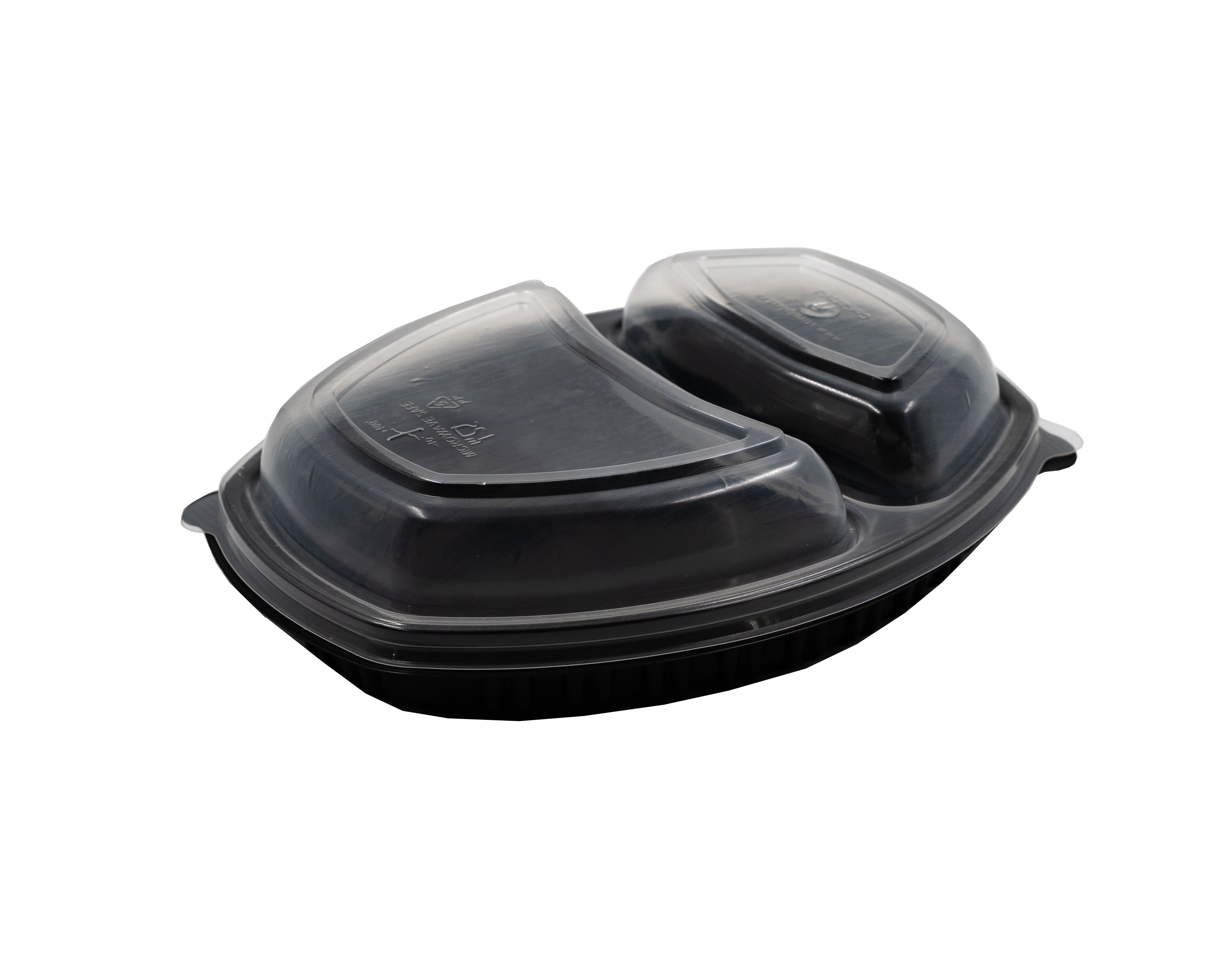 Одноразовый овальный 2-х секционный пластиковый контейнер ланч-бокс для горячего. Прекрасно выдерживает температуру горячих блюд, а также можно разогревать в микроволновой печи (СВЧ).