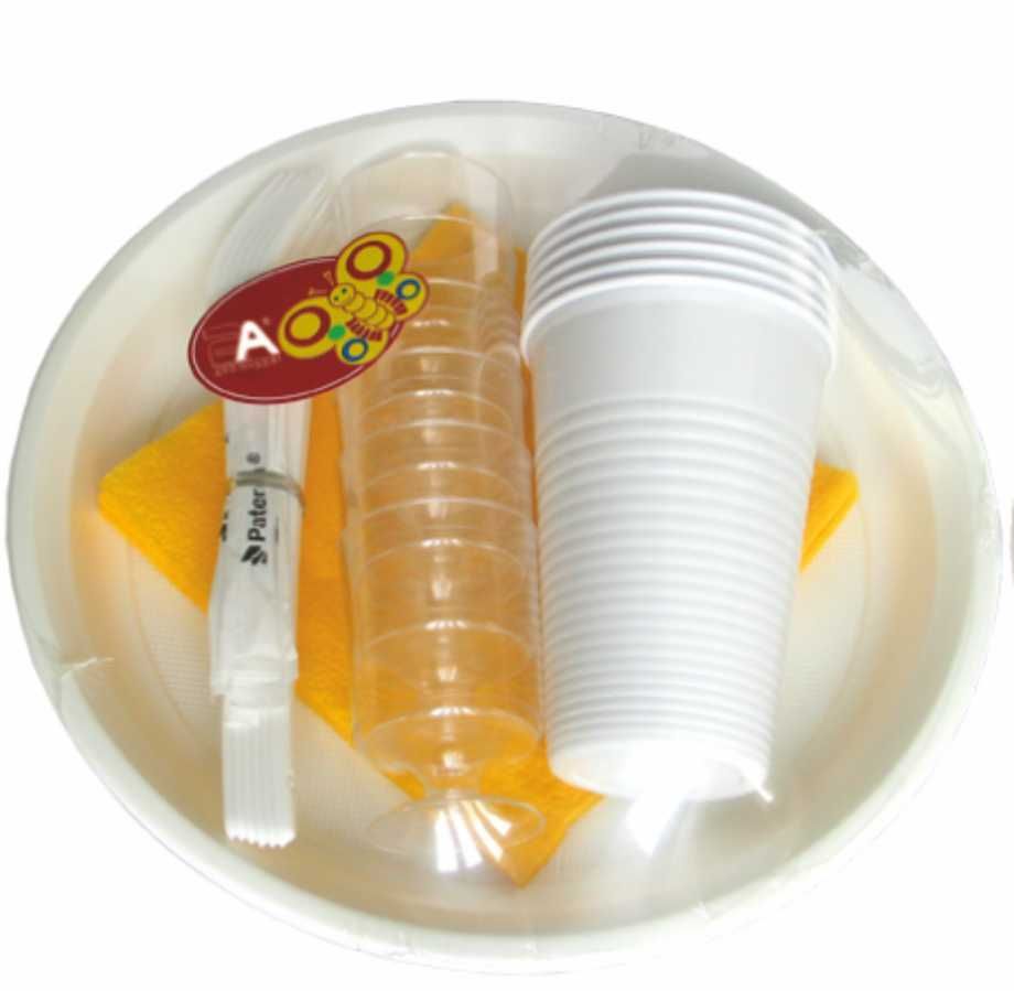 В наборе: тарелка 205 мм — 6шт, рюмка 0,05 л — 6шт, стакан 0,2 л — 6шт, вилки — 6шт, зубочистки в индивидуальной упаковке — 6шт, салфетки